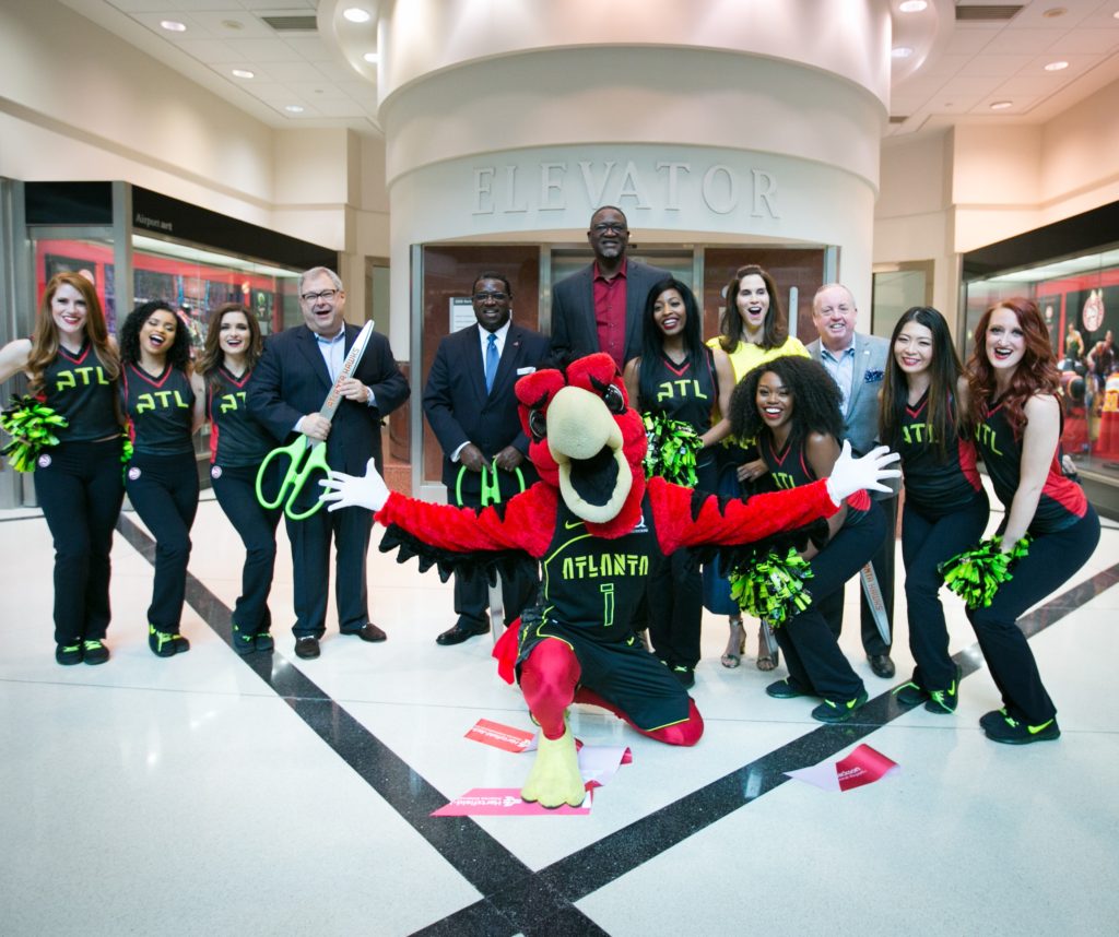 ATL and Atlanta Hawks officials celebrate opening of Atlanta Hawks exhibit at Hartsfield-Jackson’s Domestic Terminal atrium April 9. © 2018 Decisive Moment Events
