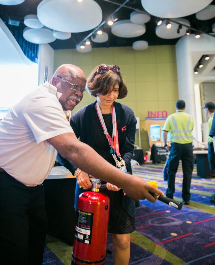 Fire inspector Edward Williams shows Meenaxi Rajput how to extinguish a fire at the third annual OneATL Safety and Risk Management Expo Aug. 15. © 2018 Decisive Moment Events