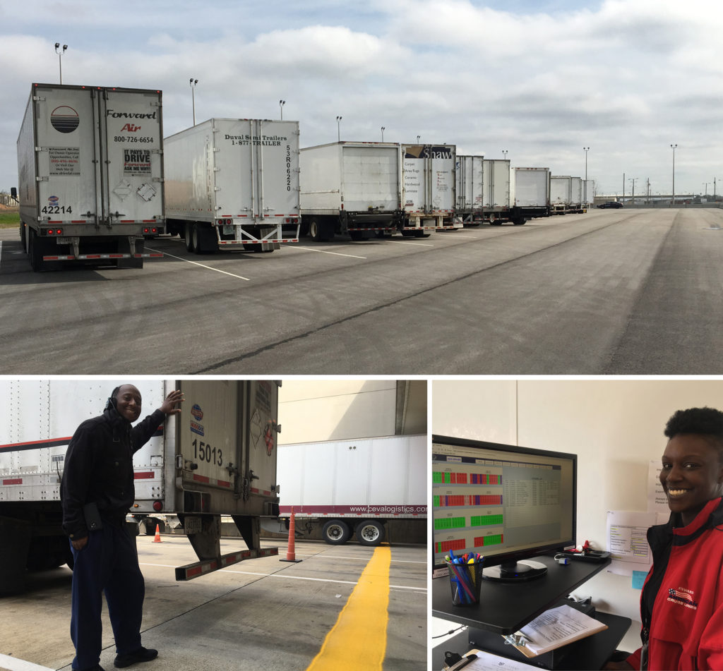Clockwise from top, trucks line up in the TruckPass lot as drivers wait for their dock assignment. A worker uses sophisticated software in the TruckPass Check-In Station. The freshly painted yellow lines show drivers where to pull up at the dock.