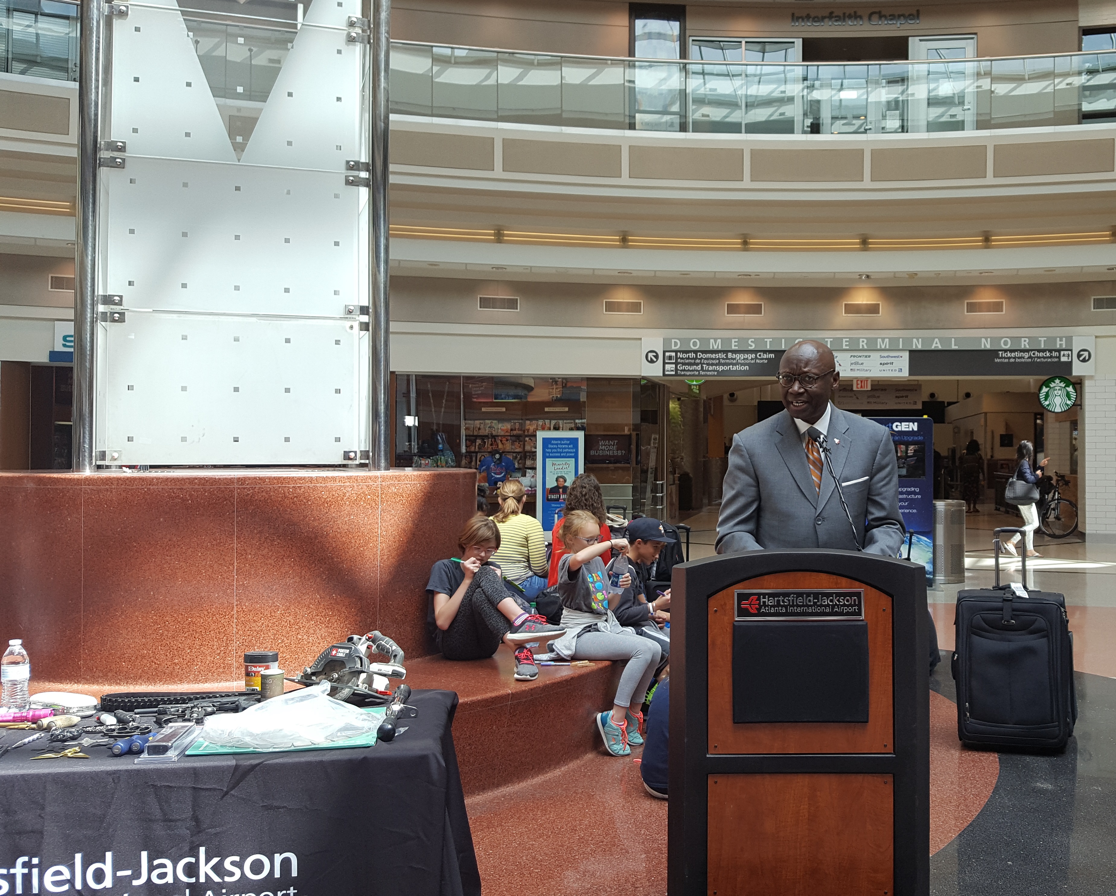 Standing next to a table of prohibited carry-on items, Airport General Manager Roosevelt Council, Jr. discusses preparation for the busy summer travel season during the May 22 press conference.