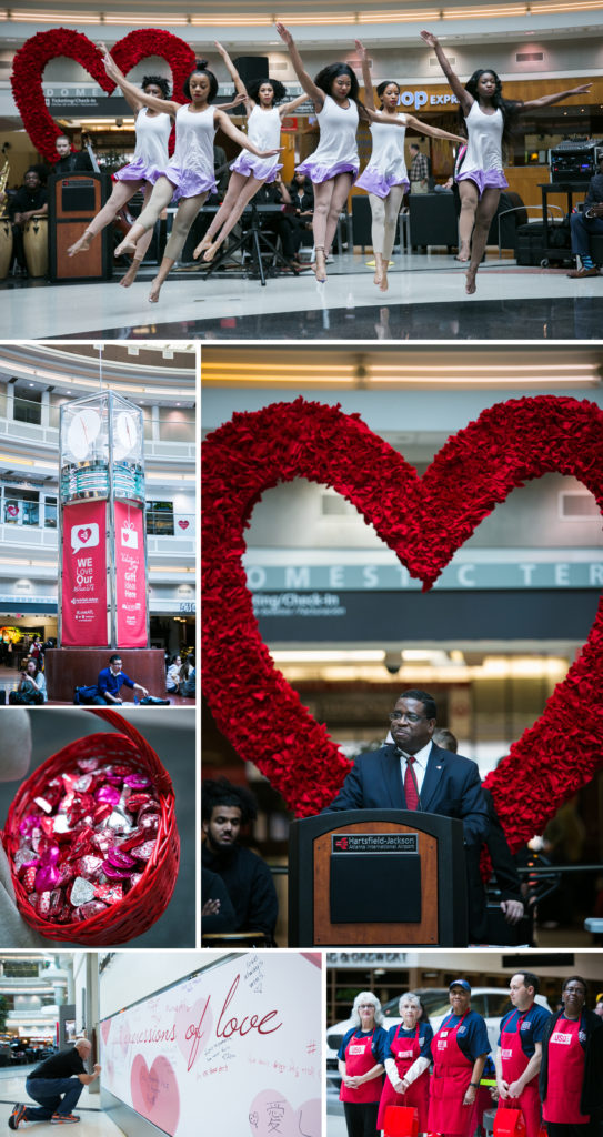 Clockwise from top: Martha Ellen Stilwell School of the Arts dancers soar at the ‘We Love Our Guests’ customer appreciation kickoff. Senior Deputy General Manager Michael Smith describes the sights and sounds to be experienced during the weeklong event. USO volunteer greeters prepare to distribute treats to passengers. A guest writes scribes a message on the “love wall.” Tasty chocolate hearts. Domestic Terminal atrium banners encourage all to share the love using hashtag #LoveATL. Photos by The Decisive Moment Photojournalism