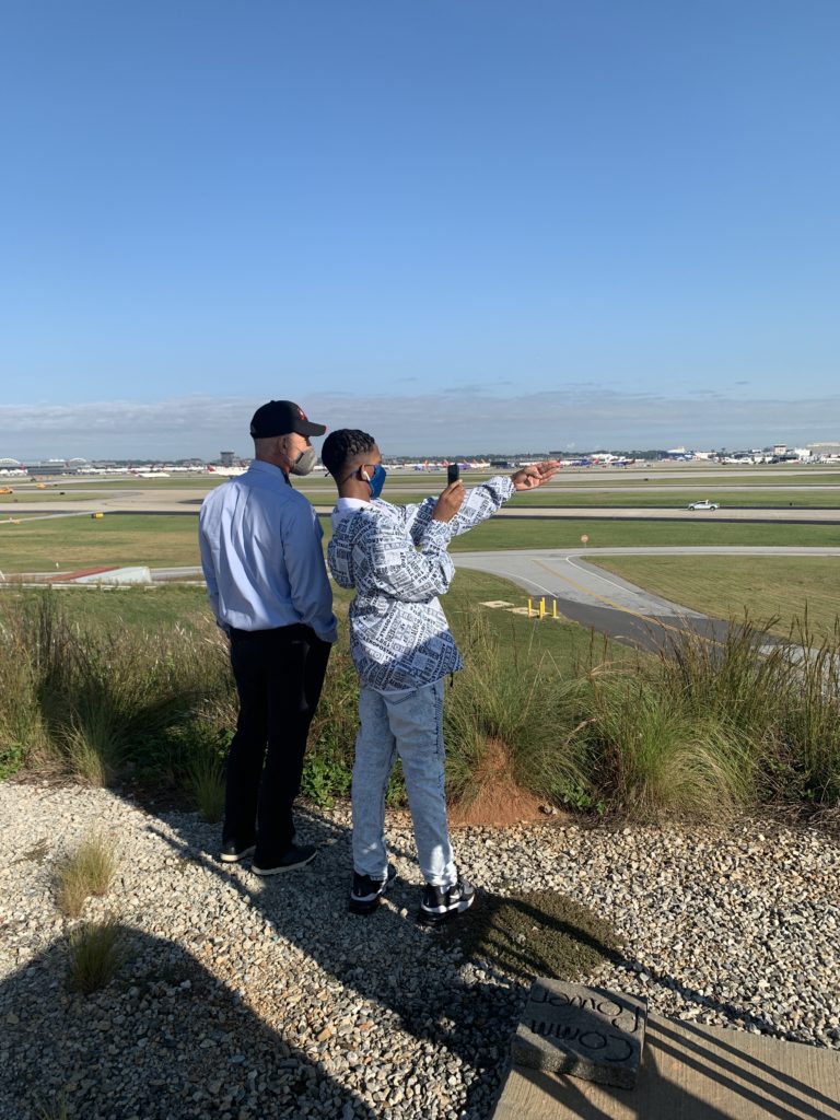 Selden was blown away by Zaron’s maturity and thorough knowledge of airplanes, how they work, and his knowledge of all the cool language that aviation pros study for years. Zaron knew a lot of it as a young teen with no formal aviation education. He gave Zaron some valuable advice for life and a Navy pilot’s pin for his mother, Jessica, to pin on him if and when he follows in Selden’s footsteps to become a Navy pilot before going to a commercial airline. They then proceeded to see ATL from a view that very few non-employees experience. They went to Stogner Hill, a hill named in honor of a beloved Airport leader that overlooks the airfield and allows visitors to monitor plane activity. As the planes went by, they played a guessing game to see who knew more planes.