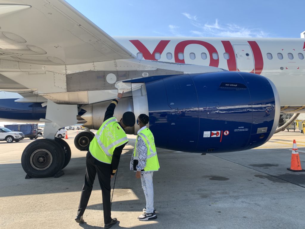 After a quick ride on the airfield over to Concourse T, Selden handed the baton to the Delta Air Lines team, who had an Airbus A321 waiting in true VIP style. Capt. Bryan Dickerson, director and chief pilot of Flight Operations, and pilot Captain Jared Hodge were standing there ready to teach Zaron some new aviation tricks. Capt. Hodge provided a thorough tour of the Airbus 321, starting from its exterior.
