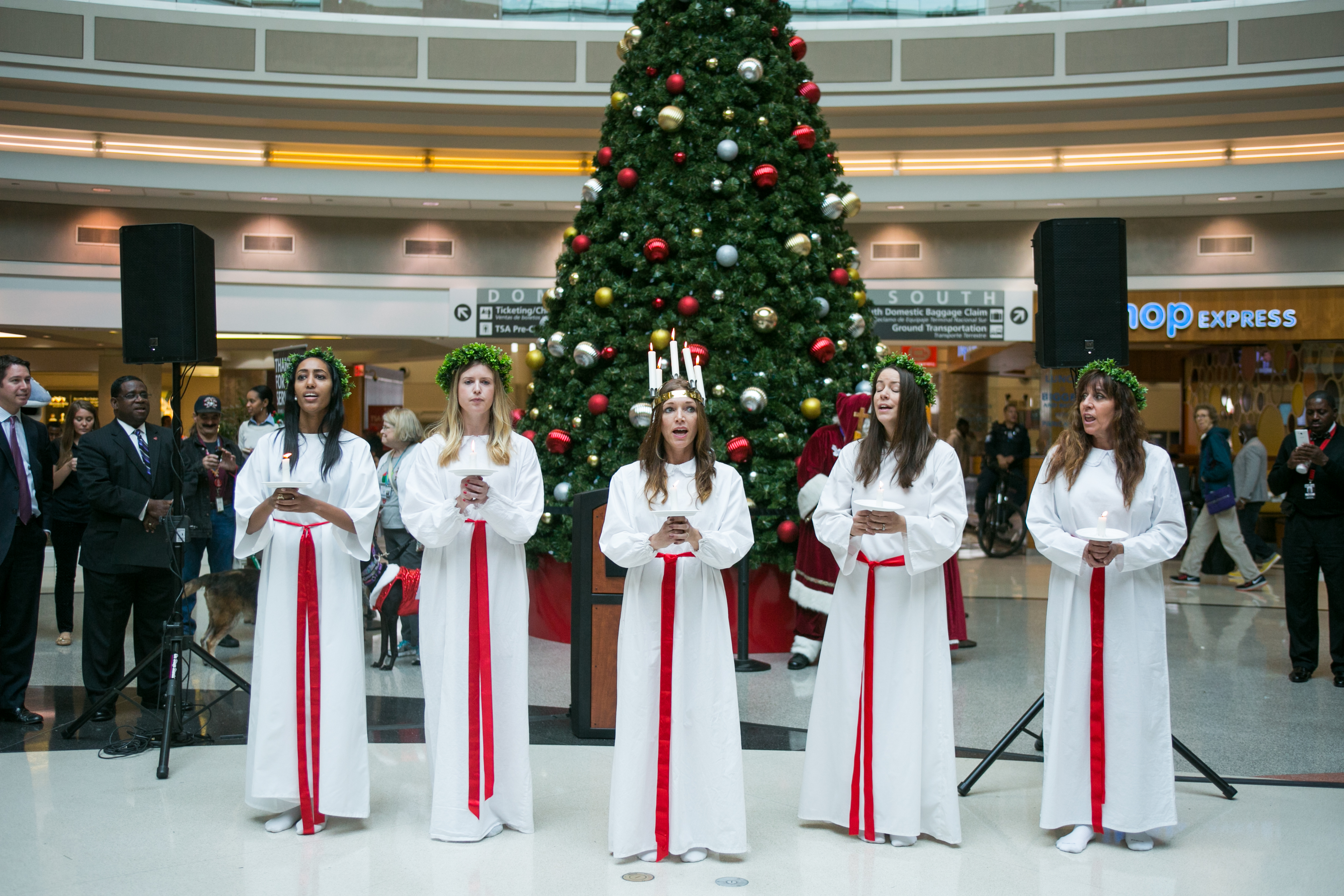 Clockwise from top: Global Consular Corps delegates pose with ATL Director of International Business Alrene Barr in front of Domestic Terminal tree. ATL’s newly lit Domestic Terminal tree. Bottom right: Traditional Swedish choir Northern Lights. Bottom left: A toddler enjoys the festivities. Left center: Greyhounds are dressed for the occasion. Upper left: A holiday ornament donated by Haitian delegate.