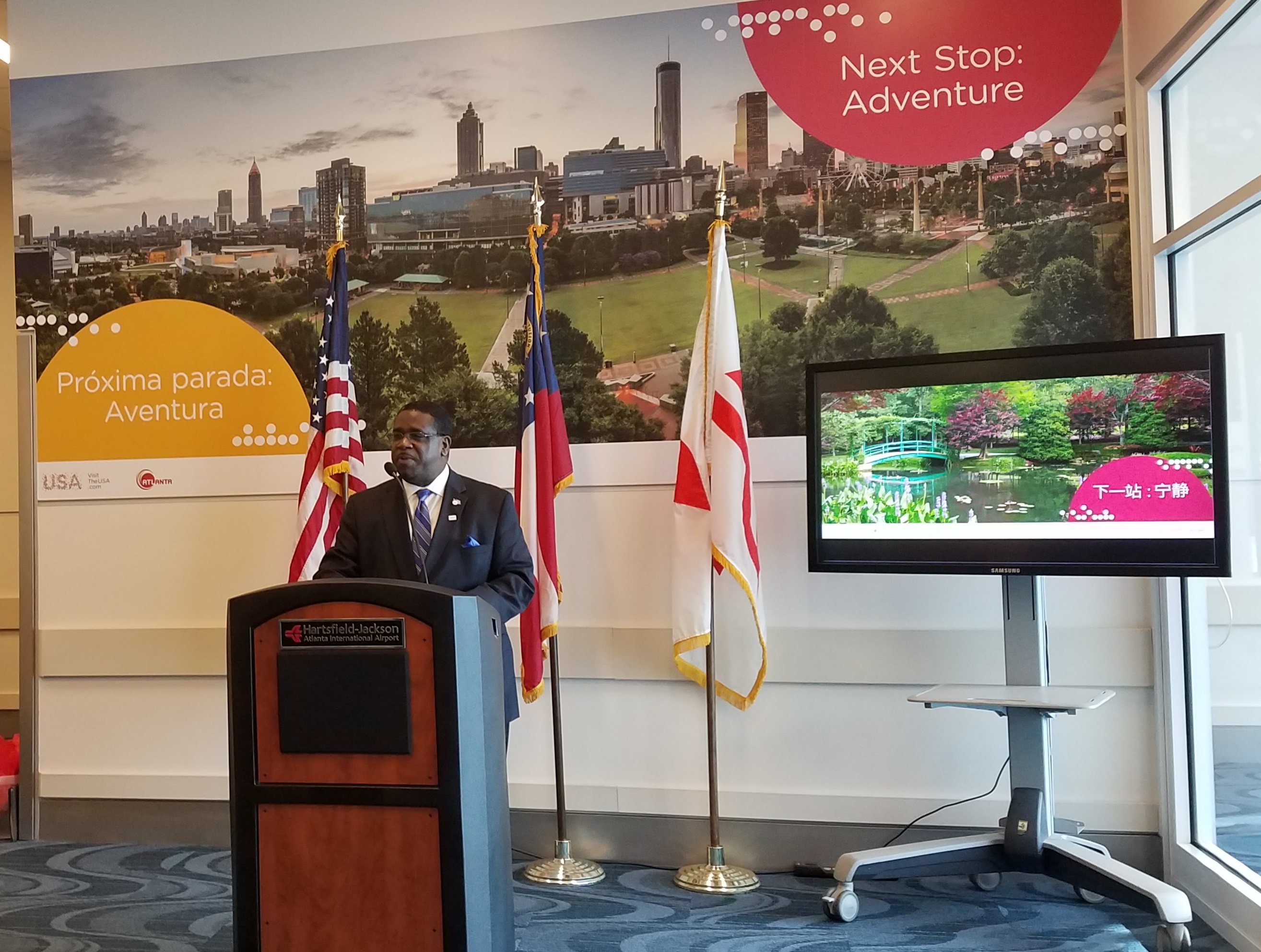 Airport Senior Deputy General Manager Michael Smith speaks to dignitaries about new marketing campaign highlighting Atlanta and Georgia attractions on Nov. 21.