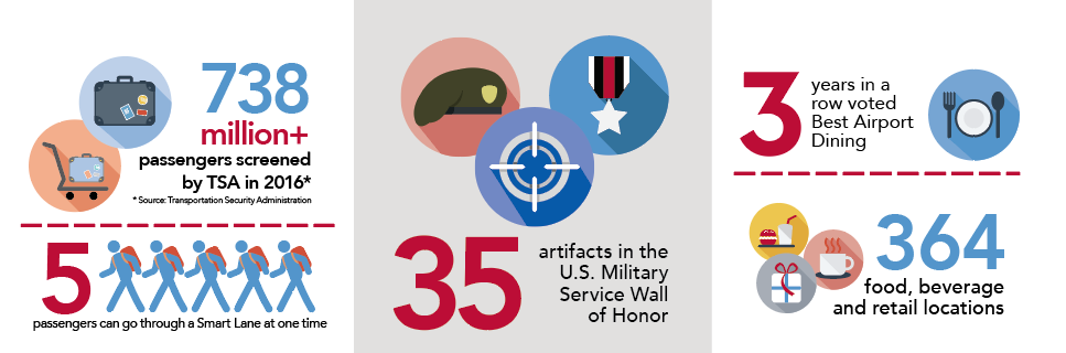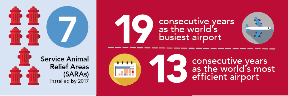 To improve the customer experience, ATL introduced Smart Lanes at the security checkpoints, Service Animal Relief Areas (SARAs) on the concourses and a simulated forest in the transportation mall.