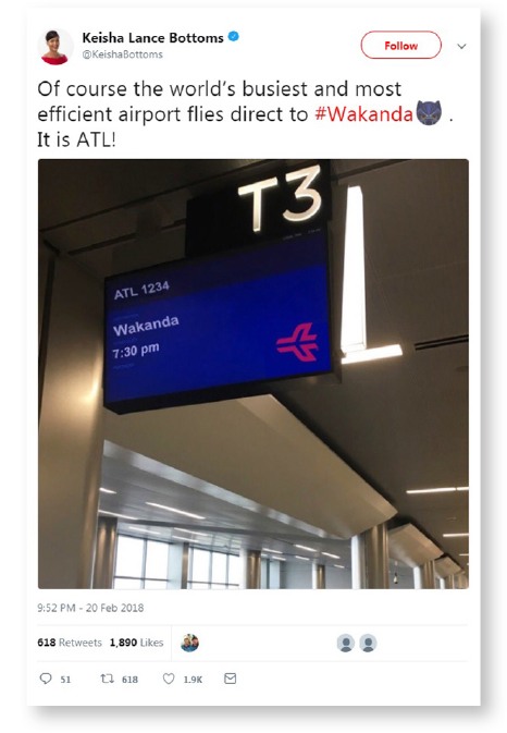 The Airport recently celebrated its most successful social media post ever thanks to the ingenuity of two Department of Aviation employees, Amany Fanous and Devin Pascoe. Timed closely to the release of Marvel Studios blockbuster “Black Panther,” the post about a “flight” to Wakanda went viral, amassing 4,472,096 impressions in days and gaining thousands of ATL followers. Fanous and Pascoe share insight into the Twitter and Instagram posts that got celebrities talking and made national headlines.