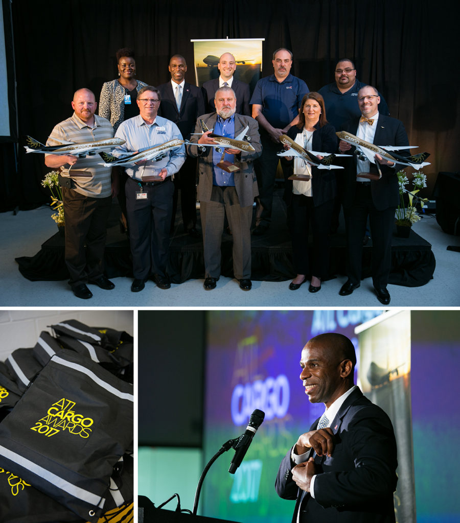 More than 100 attended the ATL Cargo Awards, which honored business and individuals (top) who are helping move ATL into the top tier among U.S. airports for cargo volume. Below right, Director of Air Service Development Elliott Paige said the event “is a way of giving back to the community and recognizing their contributions to the growth and development of cargo in and around the Airport.” © 2017 Decisive Moment Events