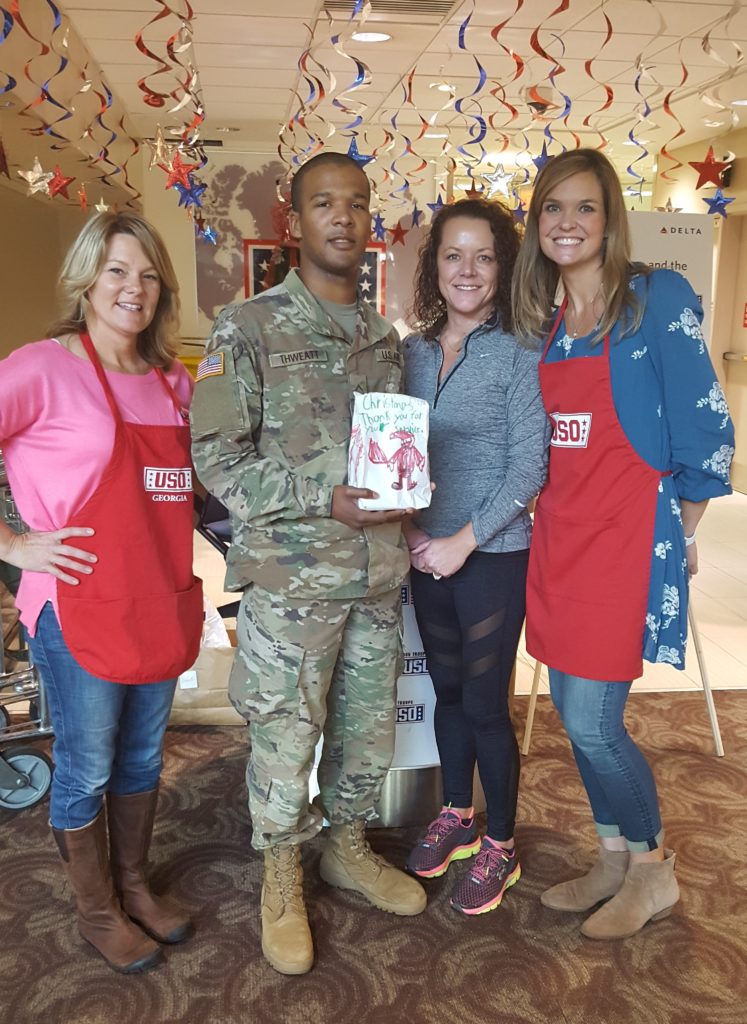 USO volunteers welcome Army soldier Trei Tweatt to ATL. From left to right: Becky Robinson, Trei Tweatt, Michelle Frank and Emily Harris. Lunch bags were decorated by local children at Sharon Elementary in Suwanee, Vickery Creek Elementary School and Pinecrest Academy in Cumming.