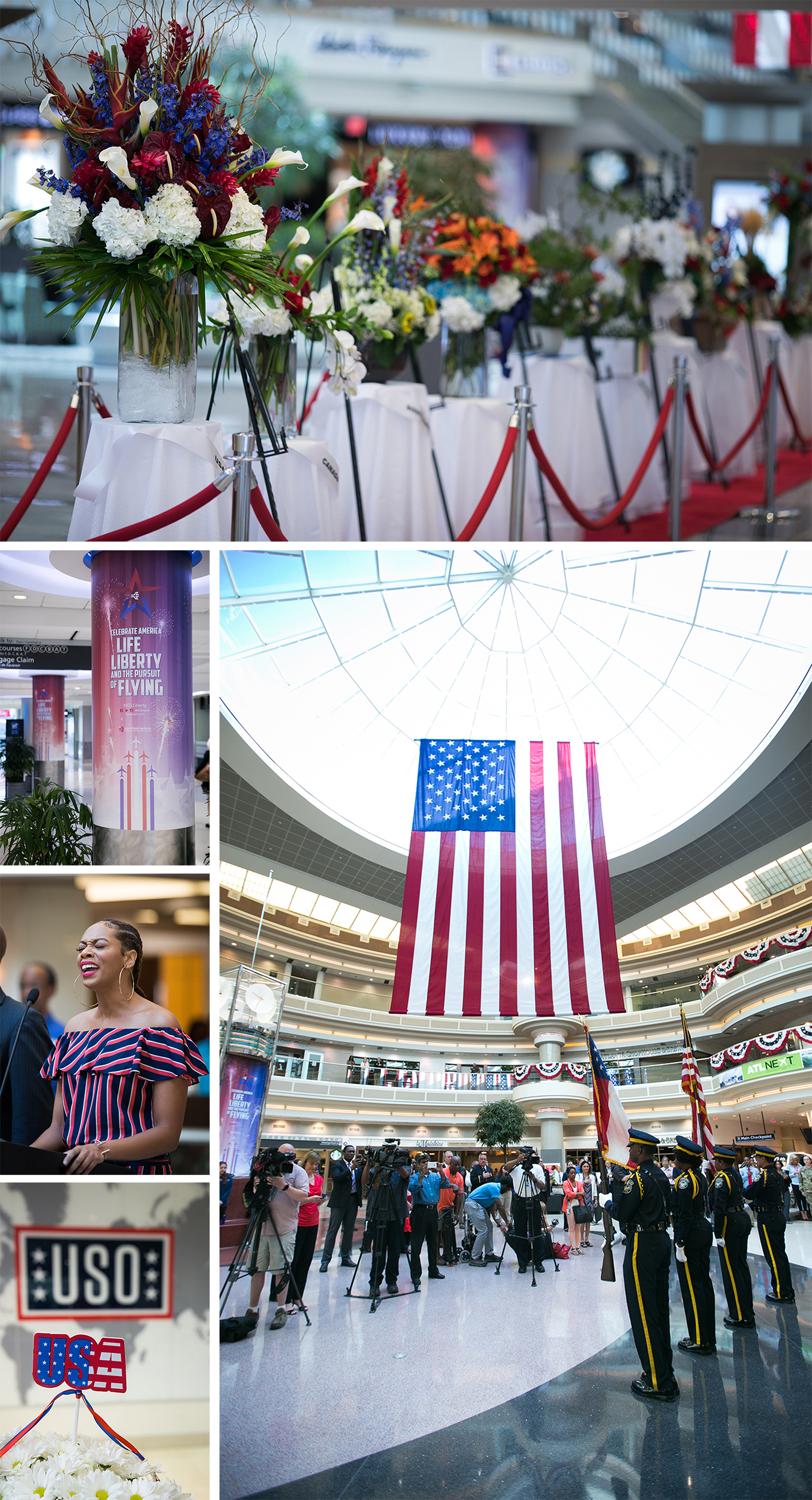 At top, representatives of the Georgia Consular Corps provided floral arrangements and letters to mark Independence Day. Above left and right, Hartsfield-Jackson kicks off the third annual “Life, Liberty and the Pursuit of Flying” campaign with a press conference in the Domestic Terminal atrium. Miss Black U.S. Ambassador 2014 Jazmine Scroggins sings the “The Star-Spangled Banner.” The event also marked the USO’s 40th anniversary at ATL. © 2017 Decisive Moment Events