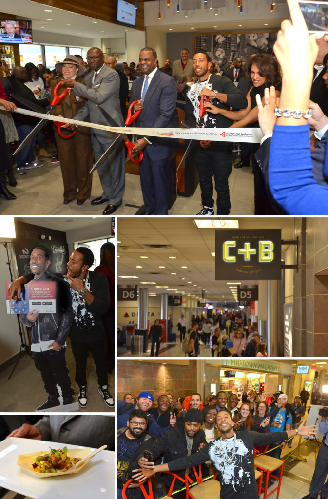 Clockwise from top: The official ribbon-cutting ceremony for new restaurant Chicken + Beer on Concourse D, a partnership between entertainer ‘Ludacris’ Bridges and Jackmont Hospitality. From left to right: Valerie Jackson of Jackmont Hospitality, Interim Airport General Manager Roosevelt Council, Jr., Atlanta Mayor Kasim Reed, Chris ‘Ludacris’ Bridges and Brooke Jackson Edmond of Jackmont Hospitality. Chicken + Beer entrance sign, located near Gate D5. The event attracted many passengers and fans, and Bridges took time to pose with them. An array of menu items were sampled during the event, including Battered Catfish with Corn Edamame Succotash. Bridges also posed with his likeness, a life-size cutout that features the iFly ATL mobile app. Photos by Chucky Kahng