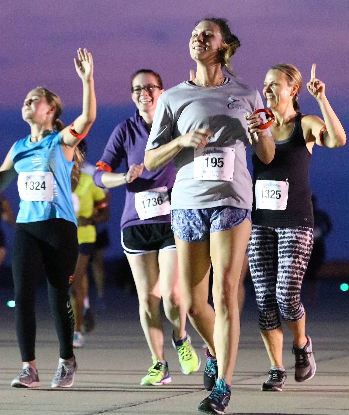 Once the horn blew, arm bands illuminated the darkness as participants raced down Runway 10-28. Many finishers took selfies at sunrise.