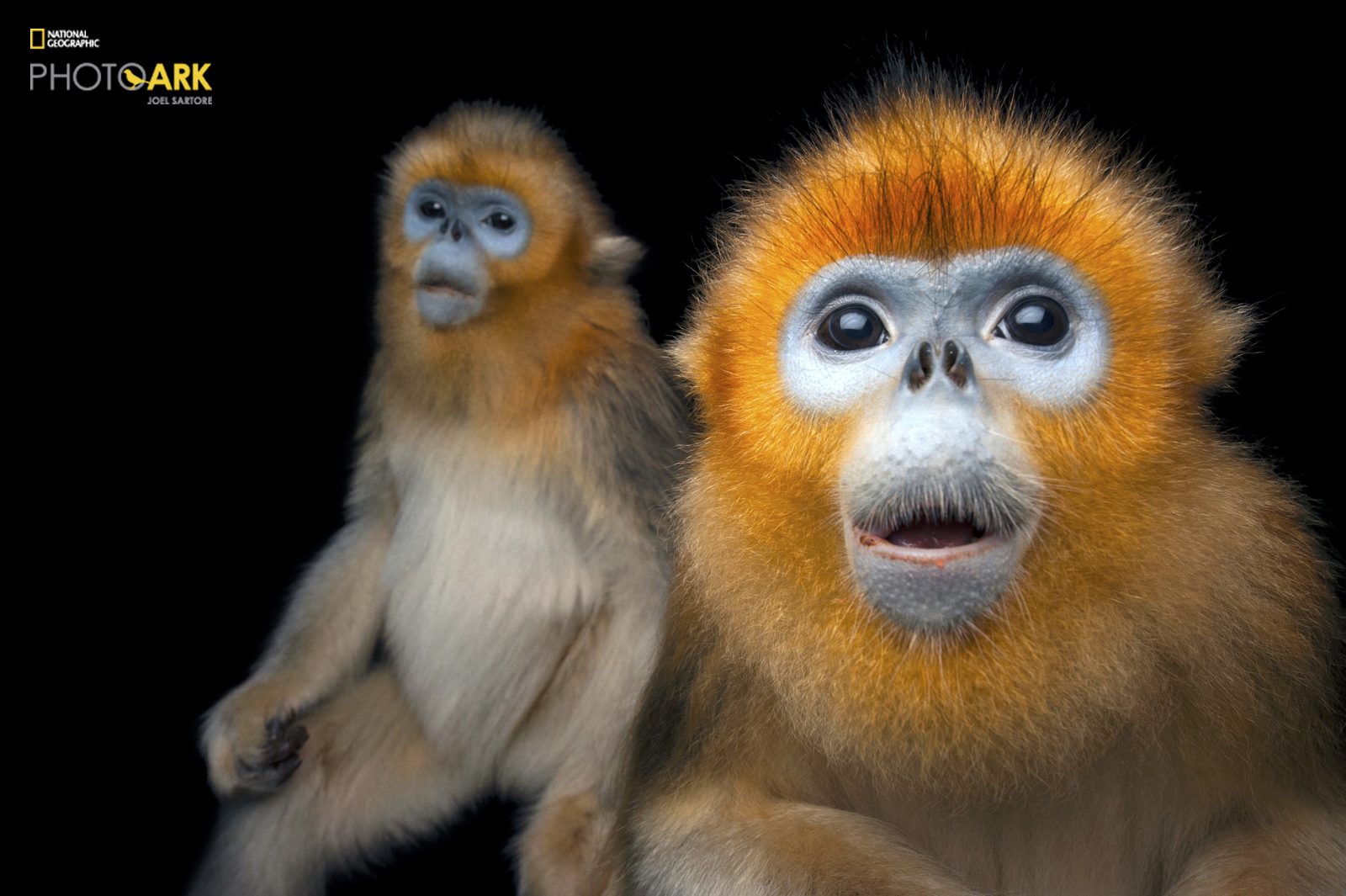 © Photo by Joel Sartore/National Geographic Photo Ark | Two Golden snub-nosed monkeys, Rhinopithecus roxellana, at Ocean Park Hong Kong.