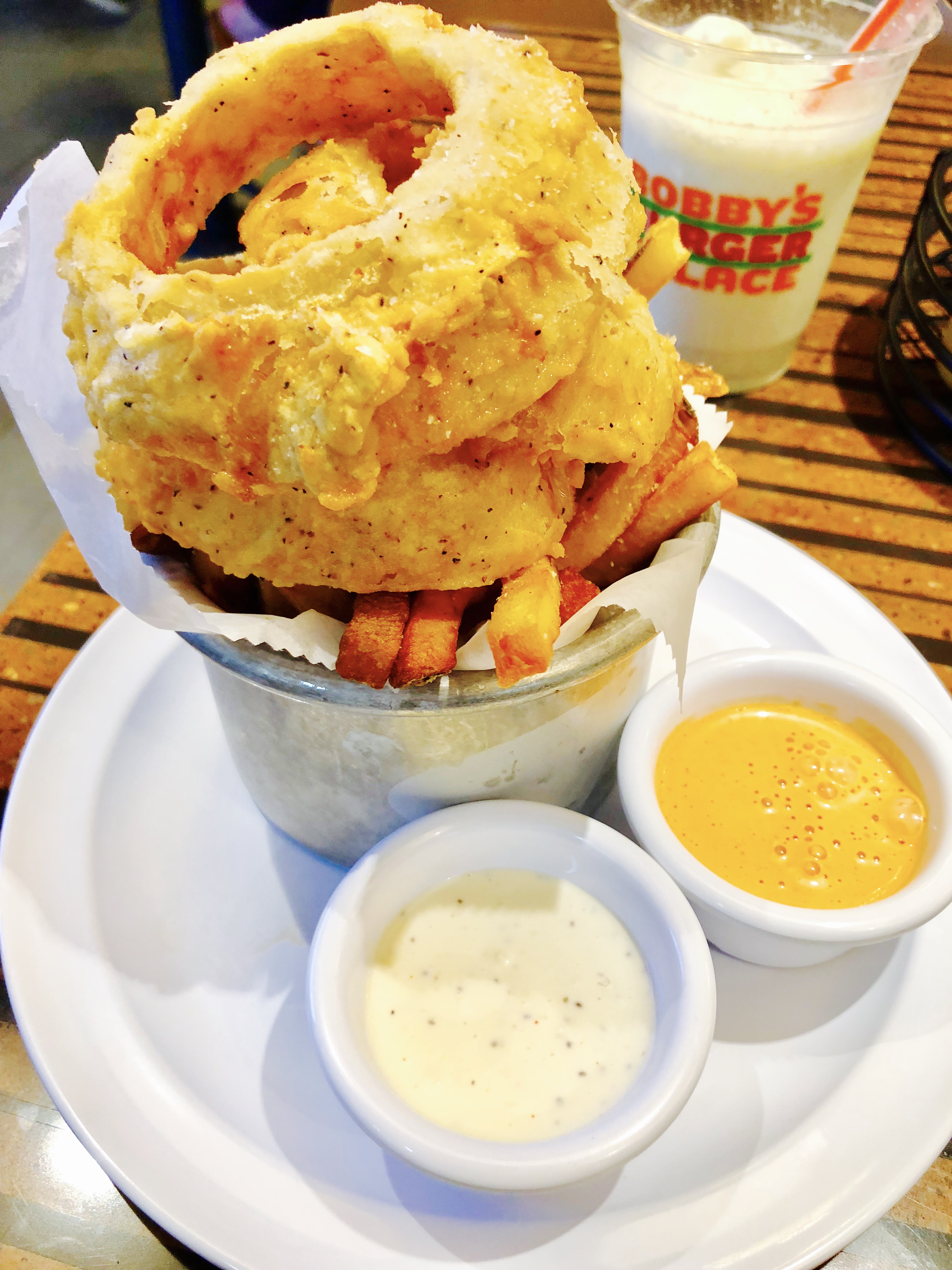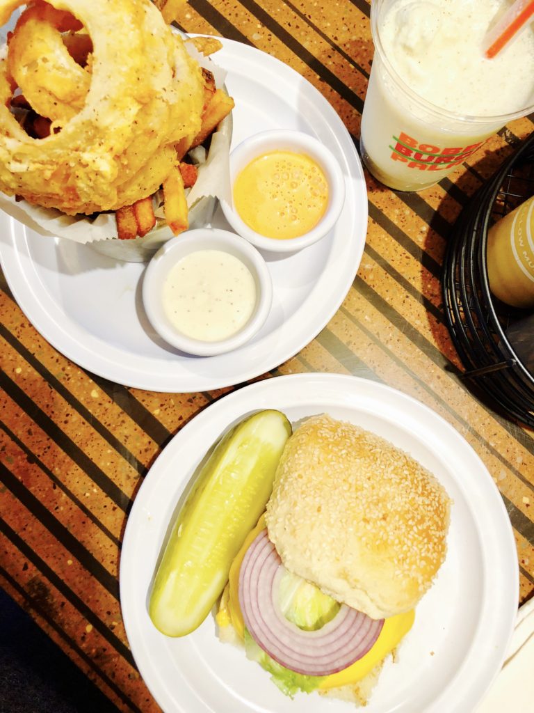 Let’s talk about the menu. First, you get the option of beef, chicken or turkey so there is a little something for everyone, even a veggie burger for the “veg heads” out there. The menu boasts 11 signature burgers each with the option to “get crunchified” (having your burger served with crispy potato chips on top) free of charge. They have an impressive selection of what they proclaim are the “world’s best shakes,” and I don’t claim to be the authority on milkshakes, but I can attest that the shakes at BBP are very, very good! When it comes to sides, they have classic fries, sweet potato fries and massive onion rings. I recommend you choose “The Undecided” options which allow you to choose two of the three to pair with your meal.