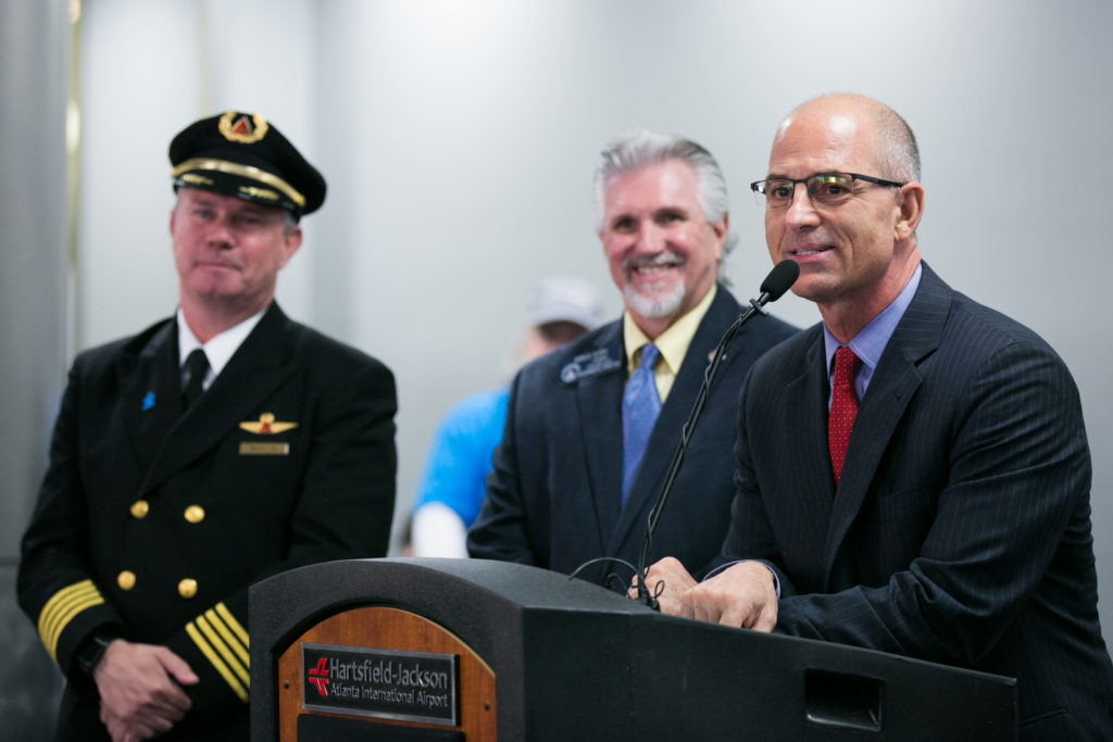 Captain Eric Ries, Georgia Sen. Greg Kirk and Airport General Manager John Selden welcome Wings for All participants at ATL. © 2019 Decisive Moment Events